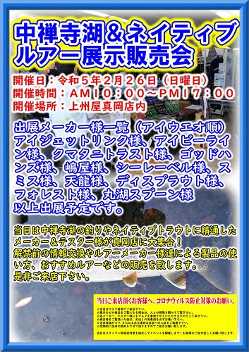 上州屋 真岡店 様にて、『中禅寺湖&ネイティブルアー展示販売会』が開催されます。