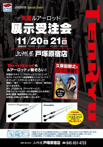 上州屋 戸塚原宿店 様にて、天龍ルアーロッド展示受注会を開催いたします。