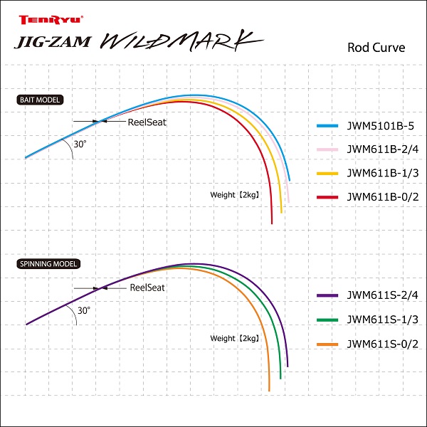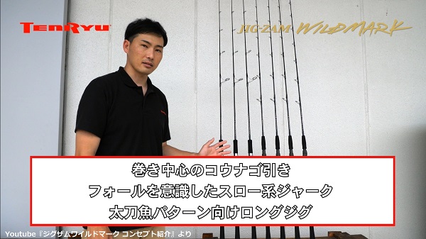 ジグの挙動をコントロール出来る適度に曲がる調子を求めたと語る。