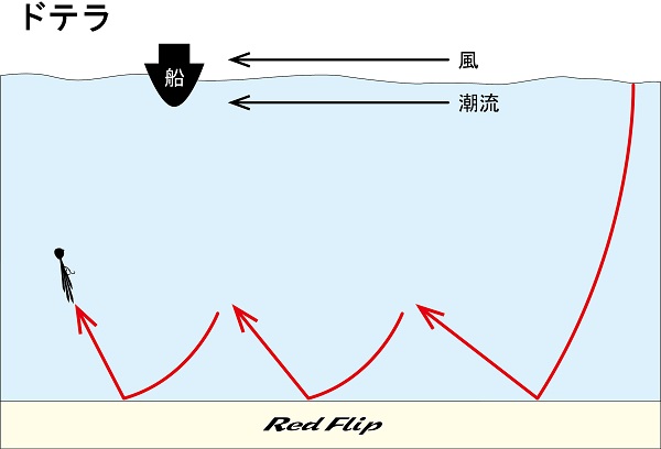 水深が浅く、広いエリアを流す場合、ドテラ流しで探る状況がある。
