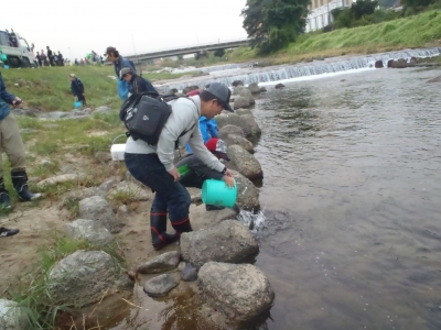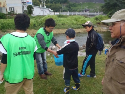 『かわらんべ』の方の協力で川に住む生き物の紹介や、