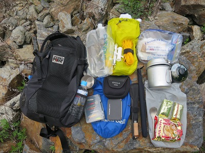 タックルの他に、水と食料、調理器具、救急セット類を、