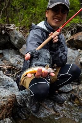 淵尻をじっくり探っていたM君に、良型の岩魚がヒットした。