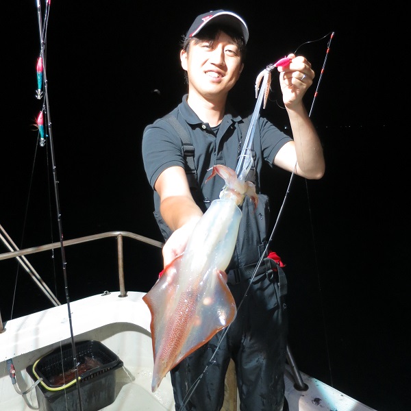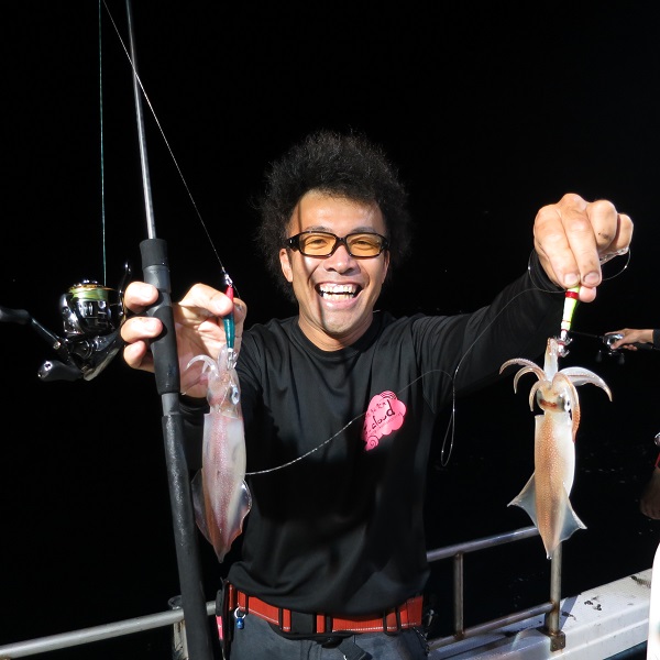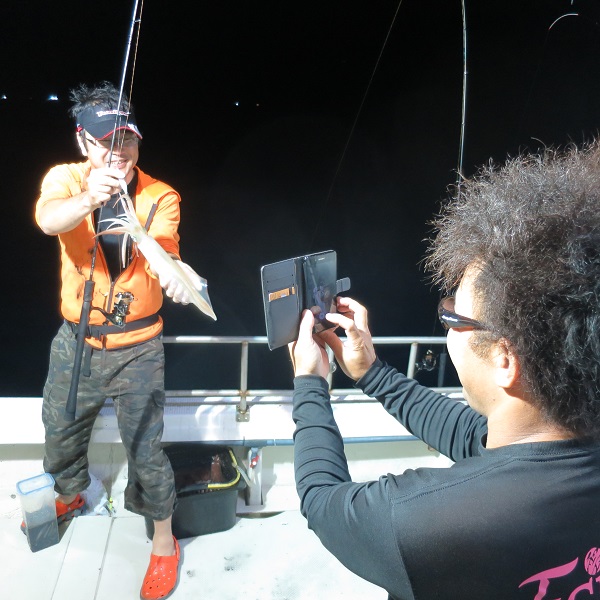 スタッフHと一緒にテストロッドで釣りを始めた船長は、次々とイカを掛け始めた。