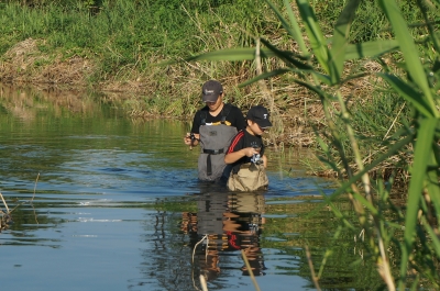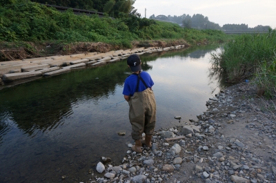 上流側へ移動しながら流れのある深みや堰下を探る。