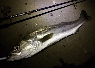 払出しにベイト(鮎?)の姿が見られ、海水との潮目がはっきり分かるポイントで、ガツンとヒット。
