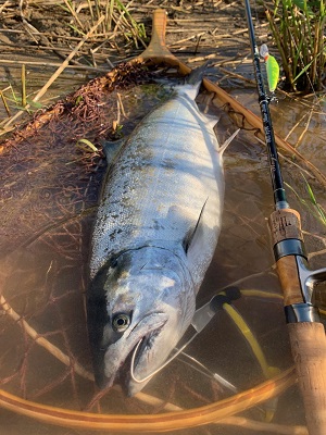 流れのあるなかでかかりましたが、しっかりとロッドが魚をいなして無事に取りこめました。