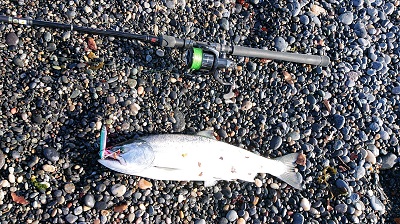 朝日が上る前からサーフに立ち、他の魚ばかりでなかなか釣れず約4時間粘って釣り揚げた一本です。