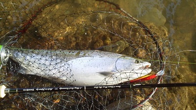 サクラマスが遡上しているかもと思いお気に入りのポイントに入りましたが、