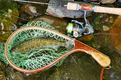 すると、見たこともないような美しい橙色模様のアマゴ(イワナとのハイブリッド?)が現れた。