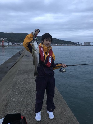 初のシーバス。この後、63cmのシーバスも釣り上げました!