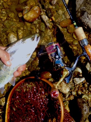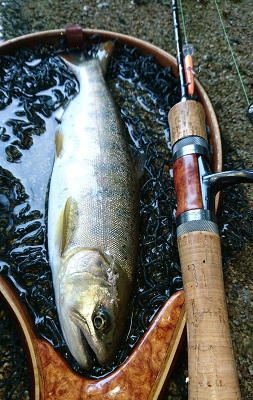 強引に寄せてなんとかキャッチ。このロッドで5匹目の尺ヤマメでした。