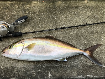 ネットを持っていなく、護岸から一か八かの抜き上げに成功しました。