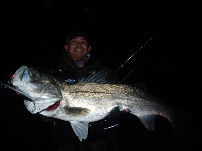 これまでよりも1周り2周り大きいシーバスがエラ洗いをしながら突っ込んでいく。