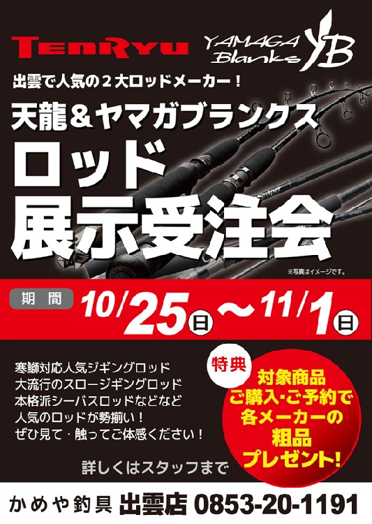 かめや釣具 出雲店様にて、ロッド展示受注会が開催されています。